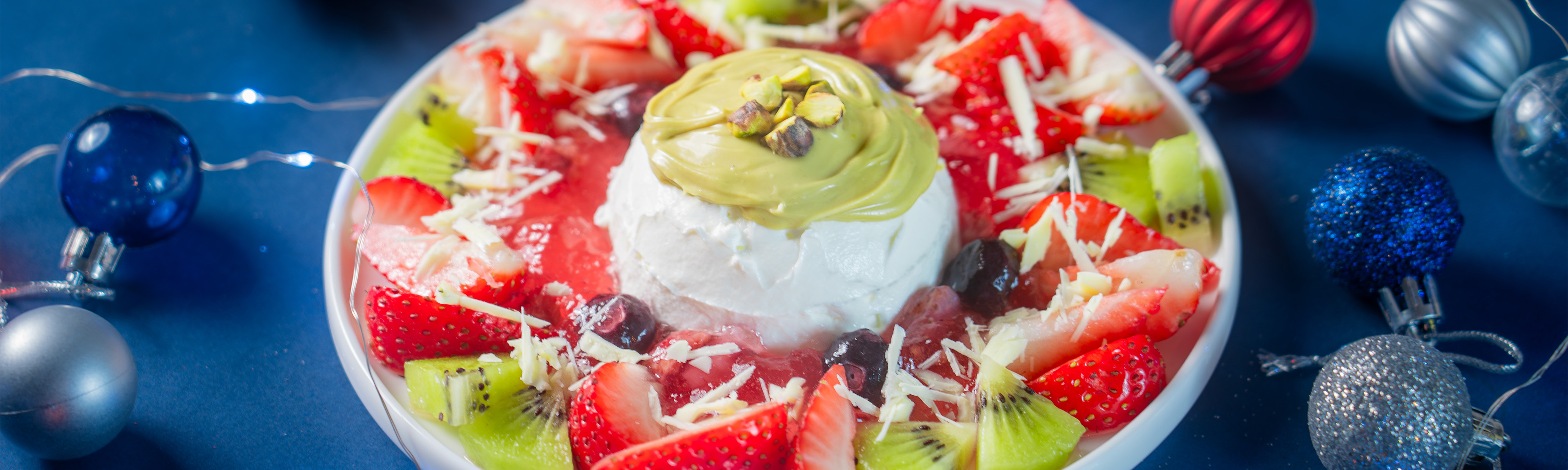 濃厚なギリシャヨーグルトに香ばしいピスタチオソースをたっぷりとかけ、ピスタチオをトッピングしました。 アップルシャンパンゼリーの爽やかな味わいに、いちご、キウイが彩りを添えています。 仕上げに散らしたホワイトチョコが、まるで雪のようでクリスマスムードを盛り上げてくれる贅沢な一品です。